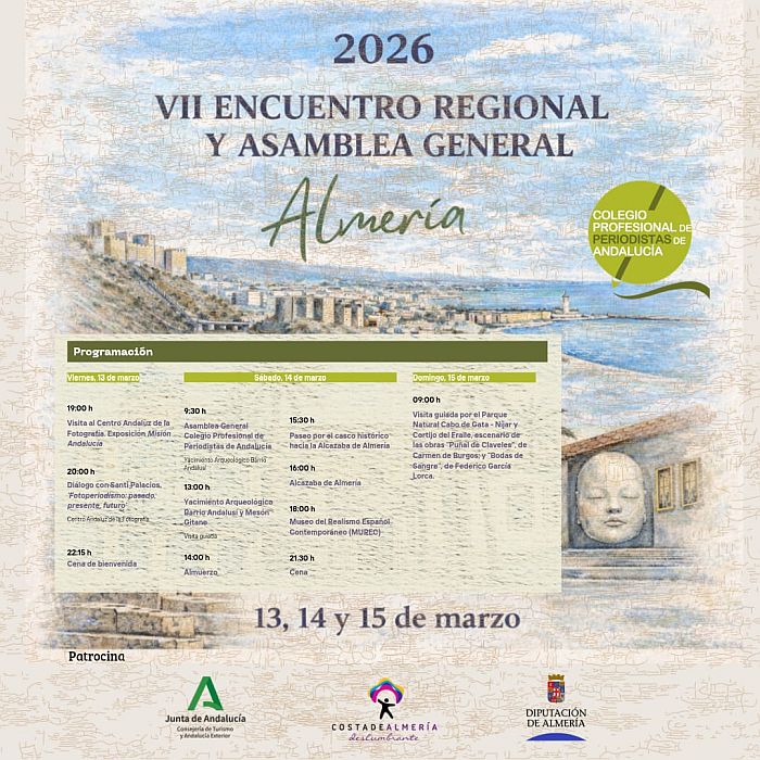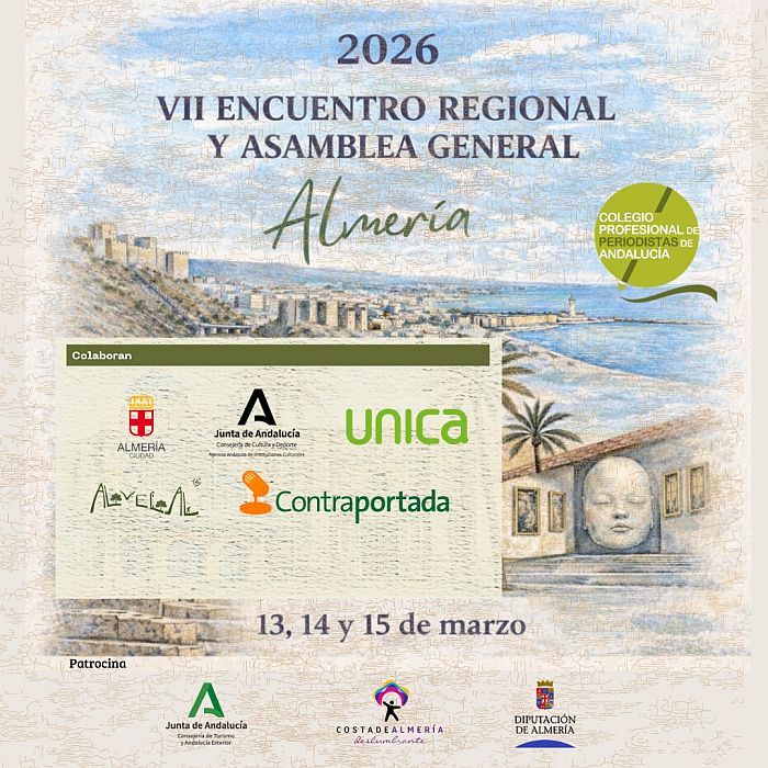 El VII Encuentro Regional de Periodistas, organizado por el Colegio Profesional de Periodistas de Andalucía (CPPA), tendrá lugar en Almería entre los días 13 y 15 de marzo de 2026. Este evento anual reunirá a profesionales de todas las provincias andaluzas y de Ceuta y Melilla, que reunirá a profesionales de la comunicación de toda la comunidad autónoma en un espacio de convivencia, reflexión y fortalecimiento institucional dentro del sector periodístico y de la comunicación audiovisual.