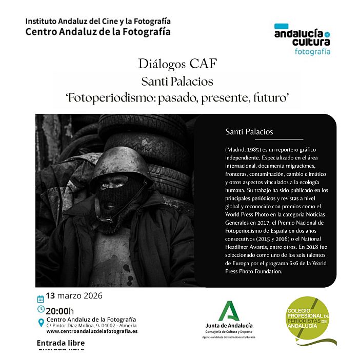 Además, contaremos con una visita al Centro Andaluz de la Fotografía en la que disfrutaremos de la exposición ’Misión Andalucía’ y se ha coorganizado con este un Diálogo con Santi Palacios, reportero gráfico independiente. Especializado en el área internacional, documenta migraciones, fronteras, contaminación, cambio climático y otros aspectos vinculados a la ecología humana. Su trabajo ha sido publicado en los principales periódicos y revistas a nivel global y reconocido con premios como el World Press Photo en la categoría Noticias Generales en 2017, el Premio Nacional de Fotoperiodismo de España en dos años consecutivos (2015 y 2016) o el National Headliner Awards, entre otros. En 2018 fue seleccionado como uno de los seis talentos de Europa por el programa 6×6 de la World Press Photo Foundation. Una sesión en la que trataremos el ’Fotoperiodismo: pasado, presente, futuro’.