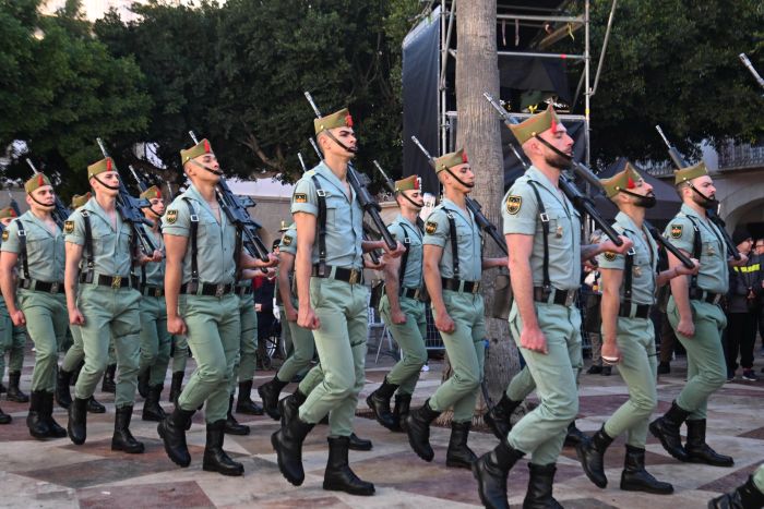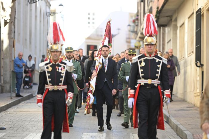 Hasta la Plaza de la Constitución han llegado también, en formación y desfile desde la Fuente de Los Peces y a lo largo de la calle Real, la Sección de Honores y de la Banda de Guerra de la Legión, acompañando también a las autoridades durante toda la jornada.
