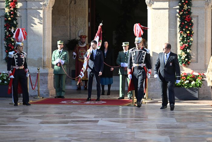 La Corporación, autoridades civiles y militares e invitados a este acto se han situado frente a la fachada principal de la Casa Consistorial para presenciar la petición de juramento por parte de la alcaldesa a quien por tercera vez en esta corporación ha portado el estandarte, el edil del Grupo Municipal Popular Oscar Bleda.