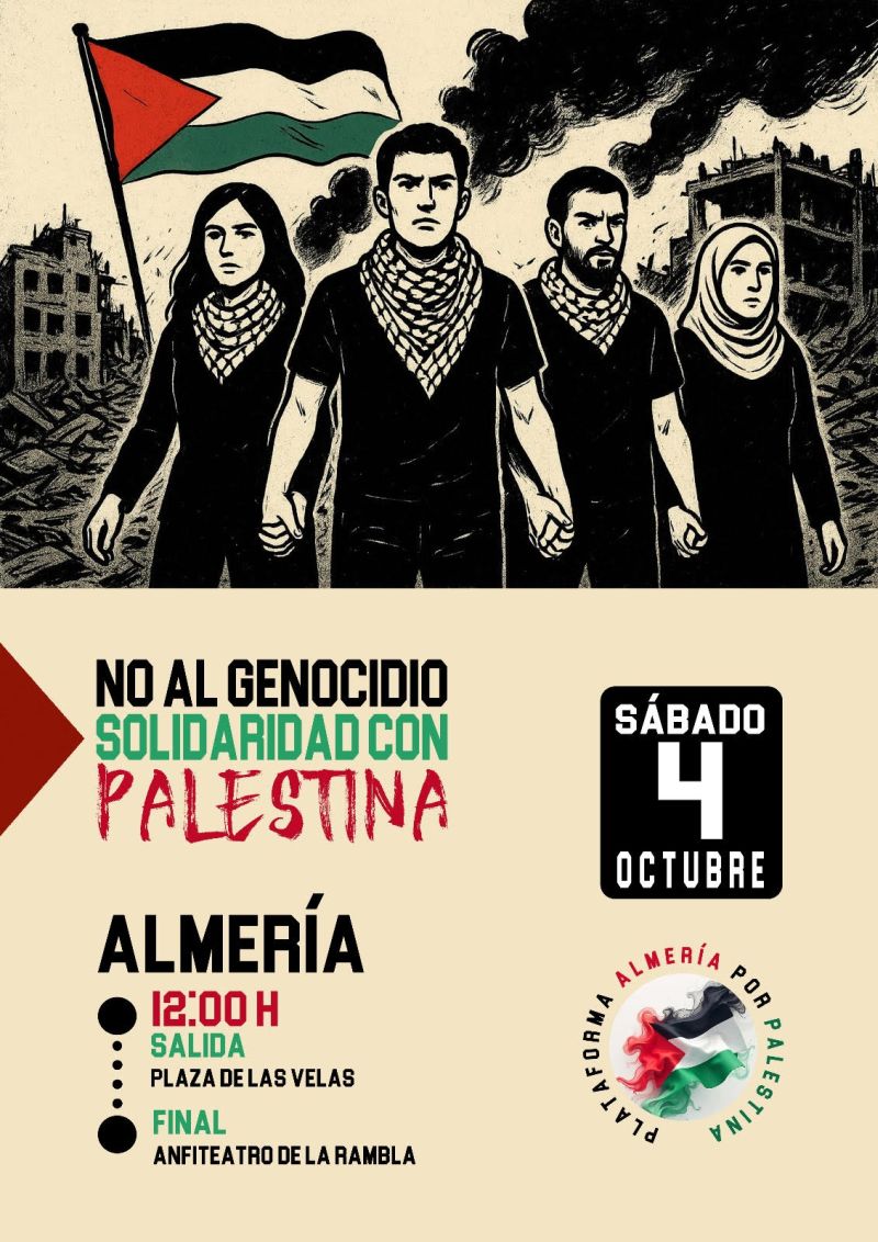 La plataforma Almería por Palestina anuncia su regreso a las calles con una nueva manifestación en defensa del pueblo palestino, ante la persistente y «coyuntura insostenible» que se vive en la región. La movilización tendrá lugar este sábado 4 de octubre a las 12:00 horas, partiendo de la Plaza de las Velas y finalizando en el Anfiteatro de la Rambla.Creada el pasado mes de junio, Almería por Palestina es un espacio de unión y compromiso que agrupa a más de 30 entidades sociales, sindicales, culturales y políticas de la provincia. Su objetivo fundamental es sumar todas las voces posibles en defensa de la vida, la justicia y la libertad del pueblo palestino, centrándose en la organización de movilizaciones y actividades de apoyo.Desde su constitución, la plataforma ha mantenido una intensa actividad, destacando las siguientes acciones:Manifestación (30 de junio) en la Rambla de Almería.