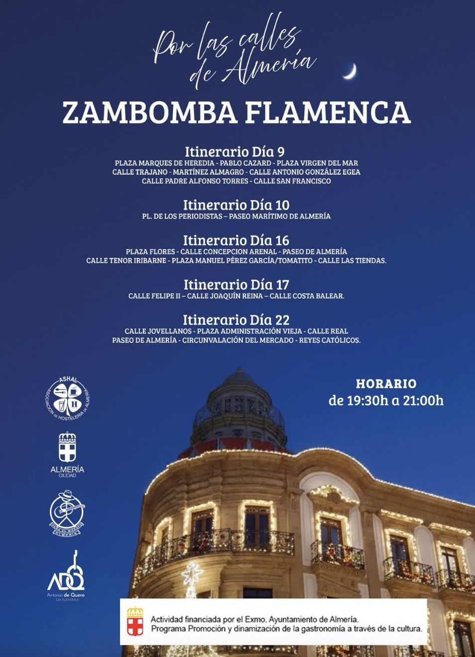 El evento, que se enmarca dentro del Programa de Promoción y Dinamización de la Gastronomía a través de la Cultura y está financiado por el Ayuntamiento de Almería, pretende combinar el ambiente festivo propio de estas fechas con la revitalización de la hostelería local. Durante cinco jornadas, las plazas y calles más emblemáticas del casco urbano y Paseo Marítimo se llenarán de compás y alegría con actuaciones en vivo, en horario de 19:30 a 21:00 horas.