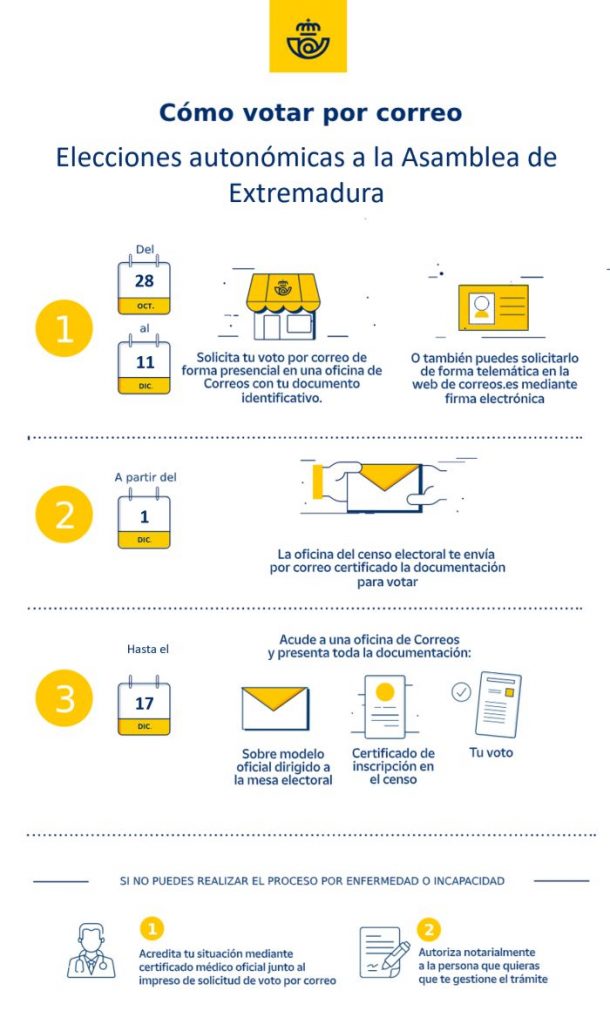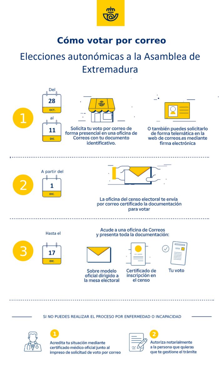 Los electores que deseen votar por correo en las elecciones autonómicas a la Asamblea de Extremadura todavía pueden solicitar hasta el día 11 de diciembre (inclusive) el Certificado de su inscripción en el Censo Electoral, vía online o presencialmente en cualquier oficina de Correos de España.