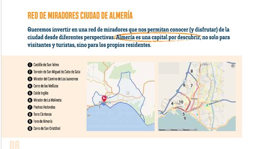 De ahí surgió la idea que presentó el partido Almerienses en las pasadas elecciones municipales a la que llamamos; Red de Miradores Ciudad de Almería. Con esta red de miradores lo que pretendemos es sacar del olvido estos rincones periféricos de la ciudad que tanto potencial de ocio tienen, esta red vertebraría esta periferia de la ciudad dándole un uso público, esta conexión se llevaría a cabo a través de senderos peatonales y carriles bici donde fuera posible, de igual manera pensamos en una intervención medioambiental en el entorno de cada uno de ellos con vegetación autóctona de la zona para fomentar la biodiversidad de nuestro municipio.