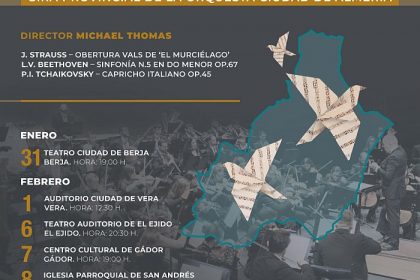 Del 31 de enero al 8 de febrero, la Orquesta Ciudad de Almería actuará en Berja, Vera, El Ejido, Gádor y Fondón. Después de brindar por el Año Nuevo con su concierto extraordinario del día 1 de enero,...