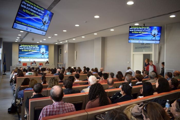 Villatoro ha tenido como objetivo prioritario “que disfruten de la charla y que vean lo apasionante que es la ciencia en general y en particular la Física”. De hecho, la ha contextualizado a la implantación de ese nuevo grado interuniversitario entre UAL y UHU, “hay que celebrarlo”, y se ha centrado en “el tiempo en la vida cotidiana”. El propio título ha sido “un juego de palabras porque el tiempo en física fundamental creemos que es una magnitud emergente, que no es una magnitud física real, sino que es resultado de algunos proceso que por ahora ignoramos, pero eso es lo que nos indica la física cuántica”. Así, “con esa excusa he hablado de la historia del tiempo, pasando por Aristóteles, Galileo, Newton, Einstein… de relatividad, cómo se define el tiempo en física cuántica y todo decorado con muchas anécdotas”. Ha dedicado el final a la neurociencia, “cómo percibimos con nuestra mente el paso del tiempo con los relojes internos que tenemos en nuestro cuerpo, que se llaman relojes circadianos”.