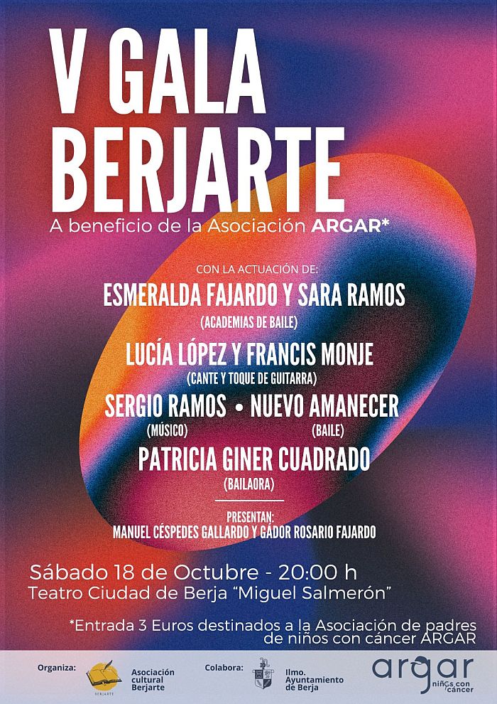 El Teatro Ciudad de Berja ‘Miguel Salmerón’ será el escenario de la V Gala Berjarte, que tendrá lugar el próximo sábado 18 de octubre. Organizada por la Asociación Cultural Berjarte, esta edición se presenta como un emotivo homenaje a la Asociación de Padres de Niños con Cáncer Argar, a la que irá destinada íntegramente la recaudación del evento.