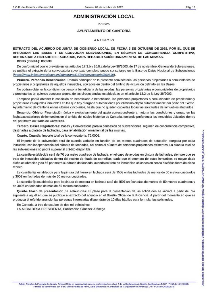 CANTORIA, 10 de octubre de 2025. El Ayuntamiento de Cantoria ha abierto la convocatoria 2025 de subvenciones para el pintado y la rehabilitación ornamental de fachadas, un programa que en los últimos años ha contribuido de forma decisiva a poner en valor el casco urbano y a reforzar la imagen identitaria del municipio. Las solicitudes podrán presentarse hasta el jueves 23 de octubre de 2025, fecha en la que se cumplirán los 10 días hábiles desde su publicación en el Boletín Oficial de la Provincia.