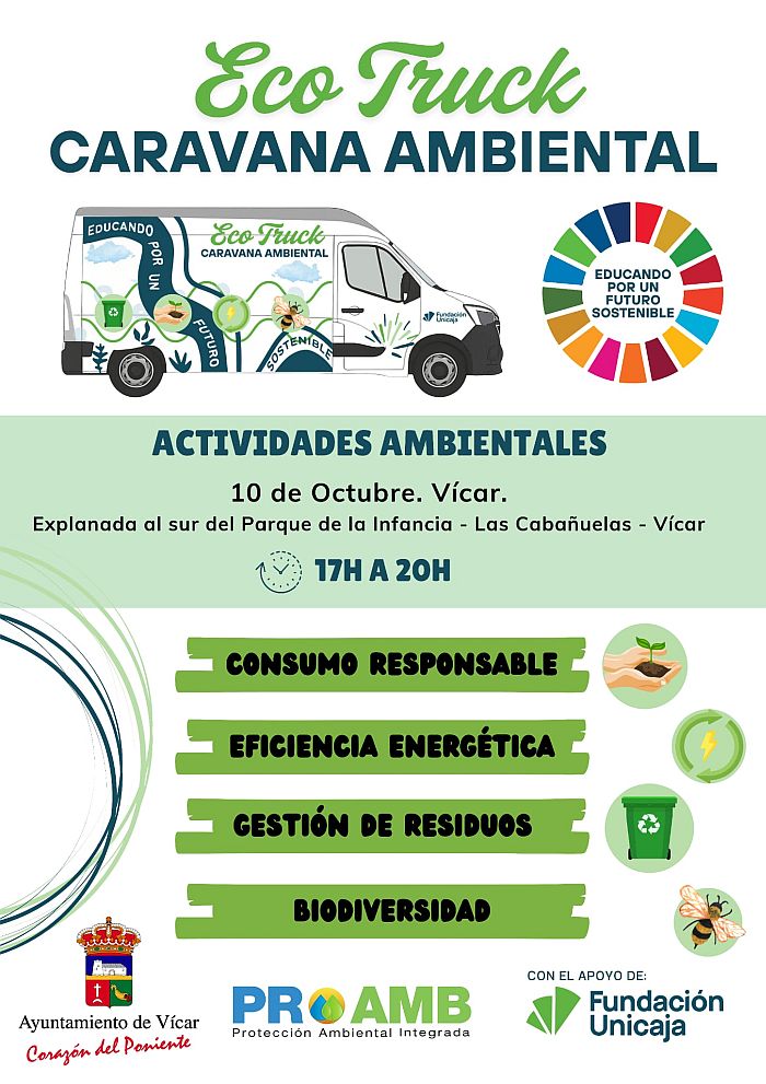 El Ayuntamiento de Vícar y Proamb (Protección Ambiental Integrada) organizan, junto a Fundación Unicaja, Eco Truck, una jornada de actividades ambientales.