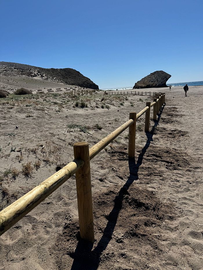 Con este segundo proyecto se está actuando en el litoral de la zona de Vela Blanca y la Playa de los Muertos, redirigiendo a los usuarios por los senderos mediante talanqueras de madera, implantación de escalones de madera y señales informativas, y cerrando al paso áreas degradadas por tránsito de visitantes fuera de senderos para proceder a su restauración mediante siembra y plantación de especies autóctonas. También se incluye la protección de los georrecursos de la duna fósil de Los Escullos y la duna de Mónsul, donde se están instalando talanqueras para impedir el acceso a la duna y señales explicando la necesidad de conservarla, y se adoptan medidas para favorecer la restauración geomorfológica de la duna mediante captadores de arena y posterior restauración de la cubierta vegetal propia del ambiente dunar.