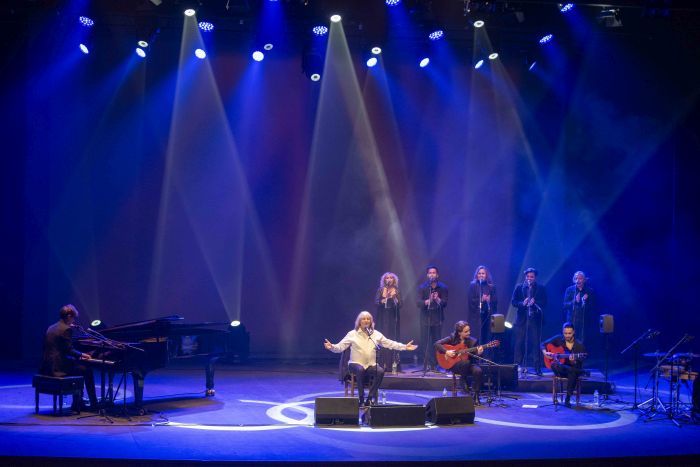 A partir de ahí, el escenario se fue poblando de sonidos y colores. Con la entrada progresiva del resto de la banda -dos tocaores, cinco coros y palmeros, y percusión, hasta sumar nueve músicos, que junto al piano y Mercé cantaron ‘Yo soy aquel’, ‘Te estoy queriendo tanto’, ‘Procuro olvidarte’, ‘Se nos rompió el amor’, ‘Se muere por mí la niña’ y ‘Soy rebelde’, reinterpretadas desde el prisma flamenco de Mercé, que supo respetar las melodías originales y, al mismo tiempo, hacerlas suyas con giros, silencios y quejíos cargados de sentimiento. El diálogo constante entre la voz y los músicos fue una de las claves de esta parte del recital.