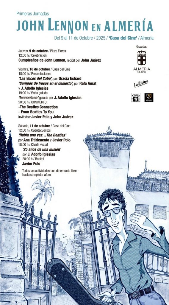 El Ayuntamiento de Almería, a través del Área de Turismo, Comunicaciones y Promoción de la Ciudad, en colaboración con la Asociación LaOficina Producciones, organiza del 9 al 11 de octubre las primeras jornadas “John Lennon en Almería”, un programa cultural y musical que celebra el aniversario del nacimiento del mítico Beatle y que servirá para relanzar la Casa del Cine, actualmente en proceso de renovación.