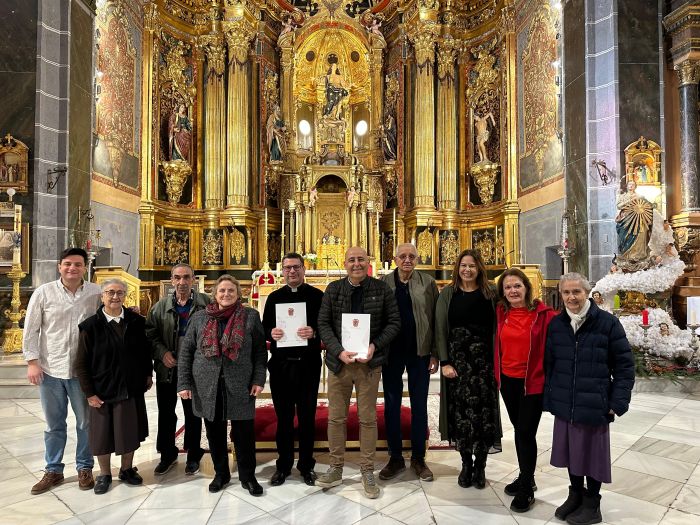 El alcalde, Domingo Fernández, junto a los concejales de Bienestar Social, y Hacienda, Ana Martínez y Adrián Ramos, han hecho entrega de la subvención al Párroco, Francisco Jerónimo Ruíz Gea, y a otros representantes de Cáritas