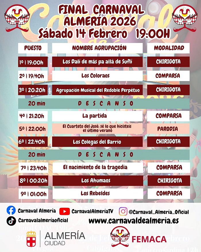 El Carnaval de Almería de 2026 celebrará sus ‘días grandes’ desde este sábado, 14 febrero, día en el que se celebrará la fiesta infantil en el Mirador de la Rambla, desde las 11.30 horas, y la gran final del concurso de agrupaciones en el Auditorio Municipal Maestro Padilla desde las 19.00 horas, hasta el domingo, 22 de febrero, día en el que se procederá al Entierro de la Sardina en el Parque de las Almadrabillas y fiesta final en el Mirador.