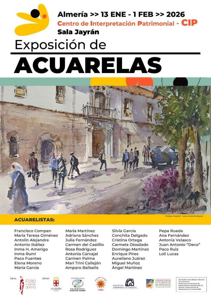 La Sala Jayrán del Centro de Interpretación Patrimonial (CIP) abre su programación de 2026 con una nueva propuesta cultural: una exposición de acuarelas organizada por el Foro Almería Centro. Tras el belén de Playmobil que ocupó este espacio durante la Navidad, la sala vuelve a llenarse de arte con una selección de más de 35 obras que retratan rincones emblemáticos del barrio del Santo y del casco histórico de la ciudad.