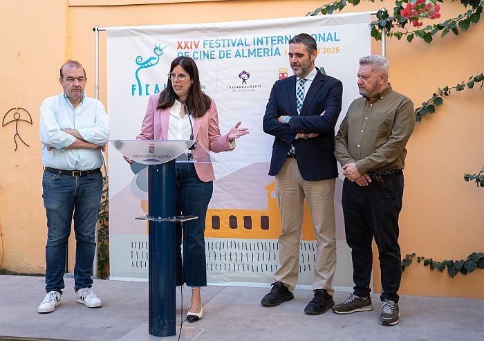 La presentación de la imagen de FICAL 2025 supone el golpe de claqueta, y el grito de ¡acción!, a innumerables actividades cinematográficas que el público podrá disfrutar en diferentes puntos de la provincia durante el festival. Esta mañana, en el Patio del Mandarino, sede del Área de Cultura, Cine e Identidad Almeriense, la vicepresidenta Almudena Morales; el concejal de Cultura, Diego Cruz; el delegado de Cultura de la Junta, Juanjo Alonso y el director de FICAL, Enrique Iznaola, han dado a conocer las claves de la nueva imagen, así como los detalles de las secciones ‘Almería en corto’ y ‘Almería, tierra de cortometrajes’.
