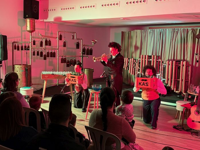 Sobre el escenario, tres músicos guiaron al público infantil por un viaje a través de la historia de la música clásica, explicada con mucho humor, ritmo y cercanía. Instrumentos de viento y percusión, tradicionales y otros de factura casera, convivieron en un espectáculo divertido, creativo y muy ingenioso, que convirtió el aprendizaje musical en un juego lleno de sorpresas y carcajadas. Una forma de despertar la curiosidad y el gusto por la música y el teatro desde edades tempranas.