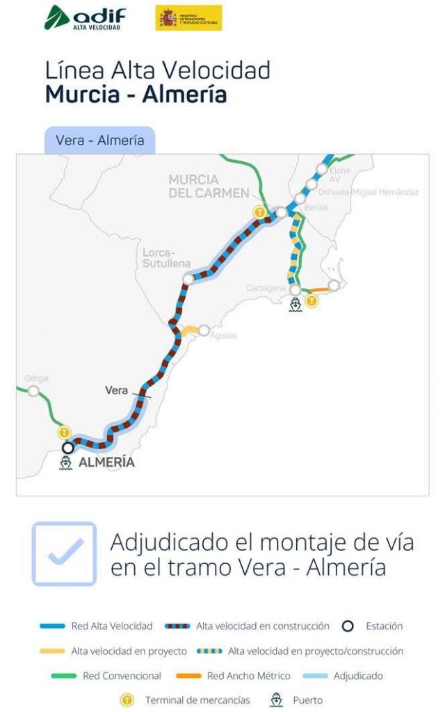 El Ministerio de Transportes y Movilidad Sostenible ha adjudicado por 31,5 millones de euros (IVA incluido), a través de Adif, los trabajos para montar las vías en un segundo trazado de la línea, el comprendido entre Vera y la capital andaluza (de 68 km), dando así un nuevo impulso al desarrollo de la Línea de Alta Velocidad (LAV) Murcia-Almería (de 200 km), eje estratégico del Corredor Mediterráneo.