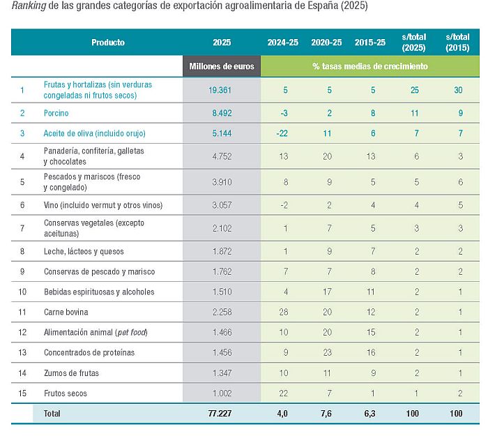 - Las exportaciones agroalimentarias españolas alcanzaron un nuevo máximo histórico de 77.227 millones de euros, con un crecimiento del 4 % en valor.