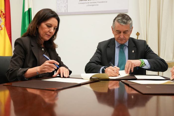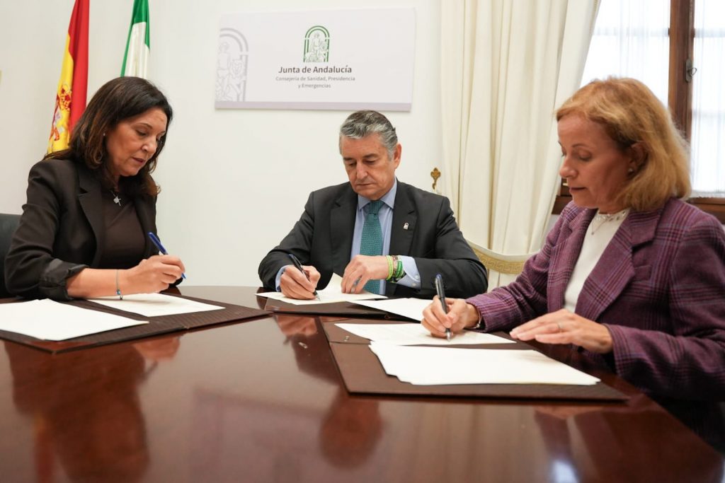 El consejero de Sanidad, Presidencia y Emergencias, Antonio Sanz, ha presidido hoy la firma de un convenio de colaboración entre el Servicio Andaluz de Salud (SAS), representado por su directora gerente, Valle García, y la Asociación Española Contra el Cáncer (AECC), en la figura de su representante autonómica, Magdalena Cantero, para impulsar un proyecto pionero de apoyo a mujeres que participan en el programa andaluz de cribado de cáncer de mama.