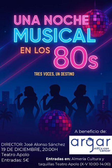 Dentro de las amplias propuestas de ocio de estas fechas pre-navideñas hay algunas que tienen mayor recompensa para el público que la del disfrute del espectáculo en sí, como es la de saber que se colabora con un buen fin solidario. Así ocurrirá este viernes, 19 de diciembre, en el Teatro Apolo de la Rambla Obispo Orberá con ‘Una noche musical en los 80’s’.