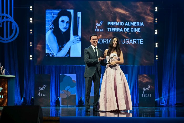 El momento de máxima audiencia ha sido la entrega del premio Almería Tierra de Cine a Adriana Ugarte, que se ha vuelto a emocionar, como ya hiciera por la mañana. Adriana Ugarte confiesa que “cuando me informaron de la estrella y el premio, me sentí sobrepasada, muy emocionada, tendré que venir dentro de dos años, de incognito, para asimilarlo” y ha añadido que “rodar en Almería me llena de energía, porque estos paisajes tienen un magnetismo y magia invisible que actúan como imán”. A su lado, el presidente de Diputación, Javier A. García, ha anunciado que “Adriana Ugarte tiene en sus manos la mayor distinción que ofrece nuestra tierra a los cineastas: El Premio ‘Almería Tierra de Cine’. Comienza una semana cargada de cine, sueños y, sobre todo, ilusión», ante la atenta mirada de la alcaldesa de Almería, María del Mar Vázquez, y la delegada del Gobierno andaluz en Almería, Aránzazu Martín, así como el director de FICAL, Enrique Iznaola.