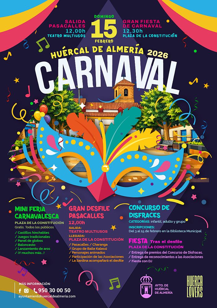 El Carnaval llegará un año más a Huércal de Almería, el domingo 15 de febrero, con el tradicional pasacalles, concursos, actuaciones y fiesta con dj, además de una MiniFeria Carnavalesca, que será una de las grandes novedades de este año propuesta por el Ayuntamiento de Huércal de Almería.