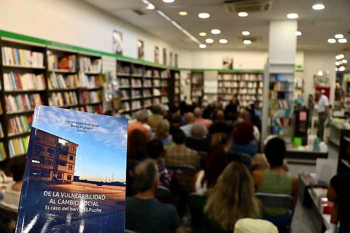 La Librería Picasso ha acogido esta semana la presentación de una obra impulsada por investigadores de la Universidad de Almería que se centra en un barrio de la periferia, como ha querido contextualizar simbólicamente en su introducción Juan Sebastián Fernández, moderador de un evento multitudinario. Publicada por Tirant Editorial, se fijaron en origen unos objetivos muy claros: visibilizar la realidad de El Puche y su estigma para el resto de los almerienses, e incidir de modo positivo en su día a día. Sus editores son los profesores e investigadores de la UAL Darío Migliucci, docente de Historia Contemporánea y coordinador del Máster en Comunicación Social, y Lucía López, profesora de Psicología Social e investigadora del Grupo ‘Estudios Psicosociales Y Metodológicos’. Juntos han sido capaces de reunir a una quincena de autores en ‘De la vulnerabilidad al cambio social. El caso del barrio El Puche’.