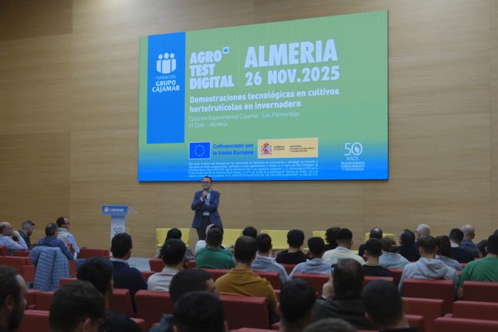 La Estación Experimental Cajamar ‘Las Palmerillas’ ha acogido este miércoles la Jornada ‘AGROTEST DIGITAL Almería’, organizada por los especialistas en agronomía de la Fundación Grupo Cajamar en el marco del Plan Estratégico de la PAC (PEPAC) 2023-2027 del Ministerio de Agricultura, Pesca y Alimentación. El encuentro, de carácter abierto y gratuito, ha reunido a más de 200 profesionales de cooperativas y empresas de comercialización hortofrutícolas, técnicos asesores, investigadores universitarios y jóvenes estudiantes de las escuelas agrarias de la provincia.