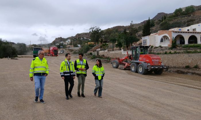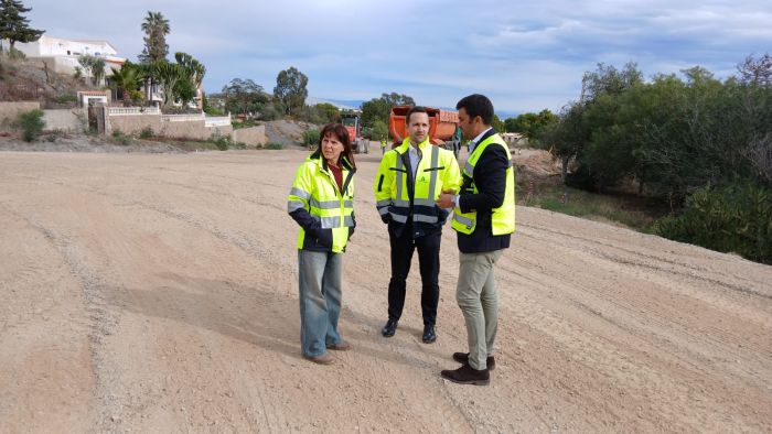 El director general de Infraestructuras Viarias, Alfonso Lujano, junto con la delegada territorial de la Consejería de Fomento, Articulación del Territorio y Vivienda, Dolores Martínez y el alcalde de Mojácar, Francisco García, ha visitado las obras que la citada Consejería y el Ayuntamiento están realizando para la construcción de la segunda fase de la Variante Costera del municipio almeriense.