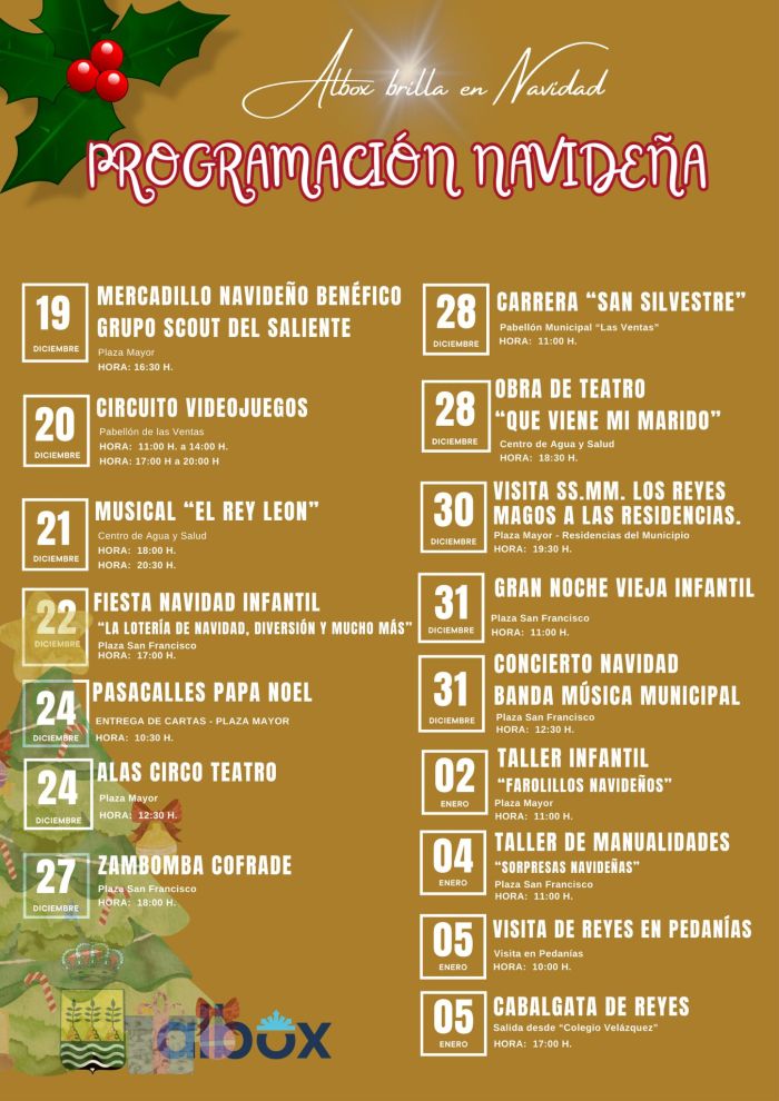 Un año más el equipo de gobierno ha elegido este emplazamiento para dar el pistoletazo de salida a una agenda cultural que crece en actividades y busca llenar de alegría y espíritu navideño a los albojenses. De hecho, esa misma tarde, y en el mismo lugar, los más pequeños podrán disfrutar de un Poblado de Hinchables gratuito.