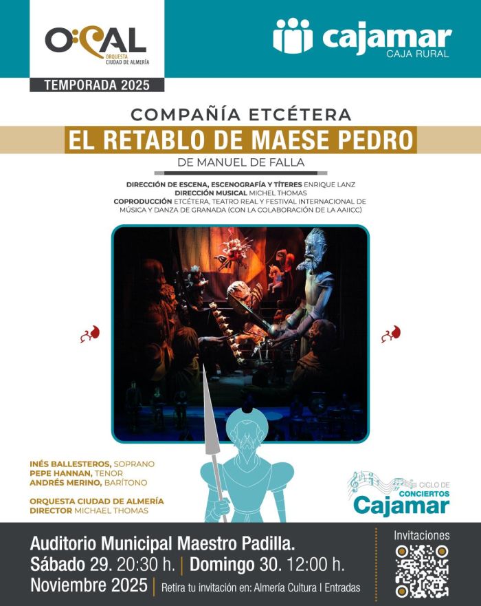 La Orquesta Ciudad de Almería (OCAL) cerrará el mes de noviembre por todo lo alto, con dos grandes llenos garantizados en el Auditorio Municipal Maestro Padilla con ‘El Retablo de Maese Pedro’. Una propuesta que mezcla la música de Manuel de Falla, con la dirección de Michael Thomas, con el teatro de títeres, creación de Enrique Lanz, y con la participación de solistas vocales de primer nivel como la soprano Inés Ballesteros, el tenor Pepe Hannan y el barítono Andrés Merino.