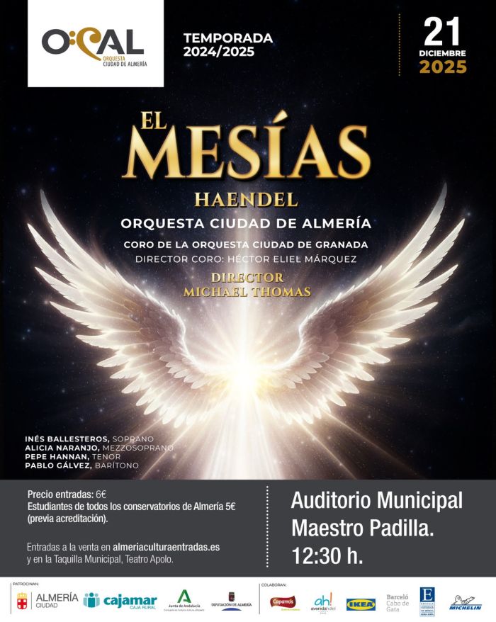 En ‘El Mesías’, la Orquesta Ciudad de Almería volverá a estar capitaneada por su director titular, Michael Thomas, contando también con grandes solistas como la soprano Inés Ballesteros; la mezzosoprano Alicia Naranjo; el tenor Pepe Hannan; y el barítono Pablo Gálvez. Además, se contará con la participación del Coro de la Orquesta Ciudad de Granada, dirigida por Héctor Eliel Márquez.