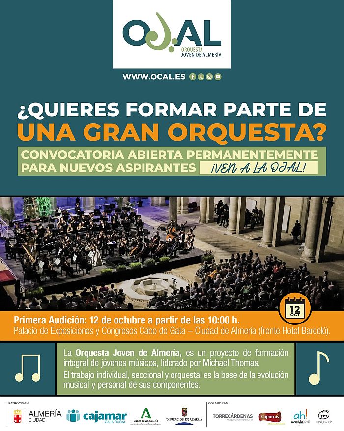 Desde la OCAL recuerdan que, aunque las solicitudes se pueden realizar en cualquier momento del curso, para formar parte del listado aconsejan realizarlas cuanto antes para optar a estas primeras plazas vacantes. Sin ir más lejos, la primera convocatoria de audiciones para la OJAL será este próximo domingo, 12 de octubre, en la sede de la Orquesta, en el Palacio de Congresos y Exposiciones Cabo de Gata, a partir de las 10 de la mañana.