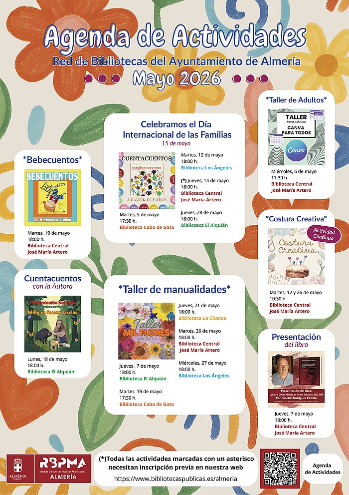 Divertido y colorido como las cruces de mayo será el taller ‘Mil Flores’, a partir de los 6 años. Será los días 7 de mayo en El Alquián, 19 de mayo en Cabo de Gata (17.30 horas), el 21 en la Biblioteca de La Chanca, el 26 en la Central y el 27 en Los Ángeles, a las 18.00 horas.