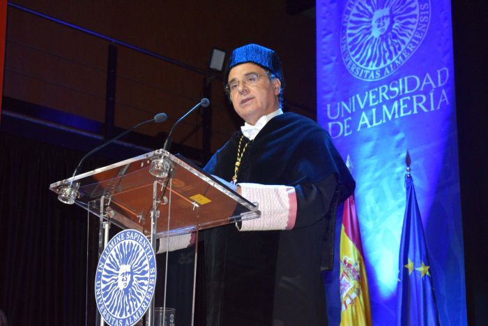 El discurso también se ha centrado en uno de los grandes desafíos de la institución: la financiación pública básica. El rector ha sido contundente al señalar la situación de la UAL dentro del modelo andaluz. “La Universidad de Almería recibe una financiación básica por estudiante que la sitúa en última posición a nivel andaluz». Y ha detallado que esta diferencia con la media supera los 600 euros por estudiante lo que “se traduce directamente en una menor capacidad para cumplir adecuadamente con nuestras funciones» y resulta “profundamente injusta». El rector ha concluido su reclamación con una firme declaración: “Nuestra sociedad no se puede permitir el lujo de ver disminuida la capacidad de aportación de una universidad como la de Almería».