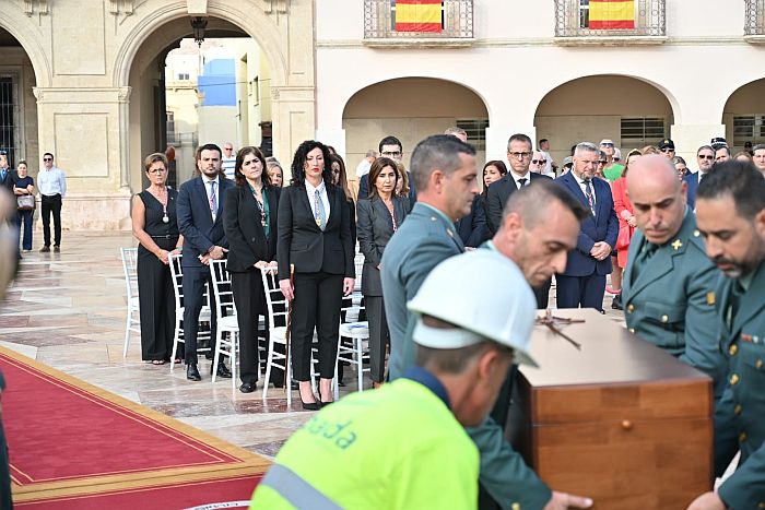 La Policía Local de Almería ha sido la encargada de escoltar al coche fúnebre desde el camposanto hasta la Plaza de la Constitución. La llegada se ha realizado por la calle Jovellanos, desde donde los ordenanzas municipales han portado los huesos recuperados hasta la mesa en la que quedaran expuestos durante la ceremonia previa a la reinhumación.
