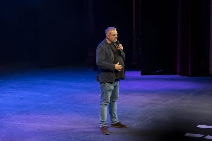 La función se articuló como un mosaico de estilos, donde cada monologuista aportó su propia forma de mirar el mundo y transformarlo en risa. Comenzó Álvaro Vera, que hizo referencia a su vida laboral con el epígrafe en Hacienda de ‘Autónomo’, contó sus experiencias con su suegro italiano y lo bonito que está Almería en Navidad. Su comedia es explosiva, apoyada en los gestos y el cuerpo, en la exageración y en un lenguaje directo que conectó de inmediato con el público.