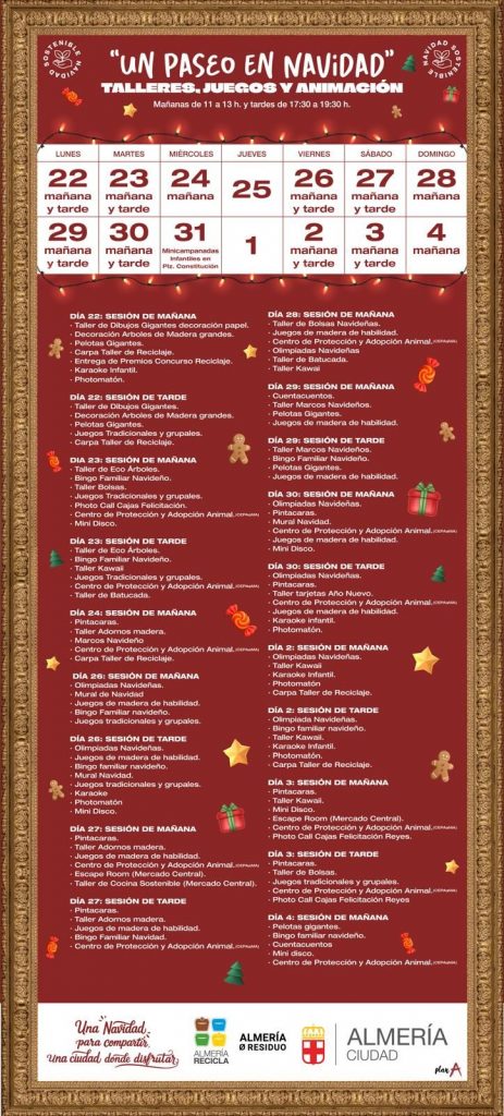 Antonio Urdiales, que ha precisado que al ser un evento al aire libre “la climatología adversa puede influir en el programa previsto, algo de lo que se informará a través de los canales habituales de comunicación del Ayuntamiento como son las redes sociales”, ha concluido invitando “a almerienses y visitantes a disfrutar de estas actividades familiares y gratuitas programadas en estos días tan entrañables”.