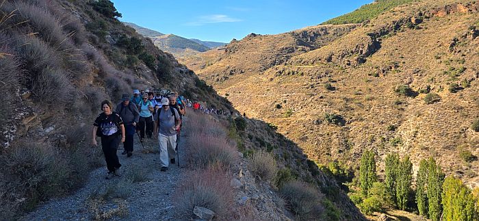Desde allí, ascendieron suavemente a través de  antiguas sendas de herradura que atraviesan pinares, cortijos en ruinas y barrancos escondidos. El sendero les fue guiando por algunos de los rincones más espectaculares de la sierra, con vistas abiertas hacia el valle del Almanzora. Durante las cinco horas y media de excursión, los senderistas pudieron disfrutar de algunos tramos de sombra y frescor, ideales para caminar con calma y contemplar el paisaje. Finalmente, el itinerario iniciará el descenso en dirección a Sierro, pueblo blanco que aparece entre bancales y olivares. Se trataba de una ruta cargada de historia, silencio y naturaleza en estado puro, ideal para los amantes de la  conexión con la montaña.
