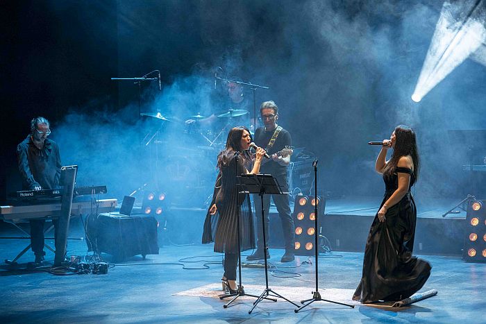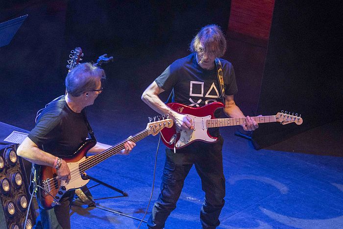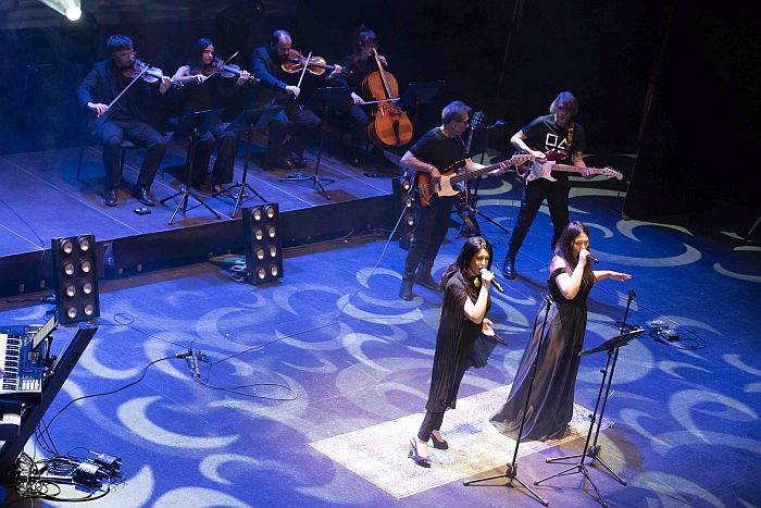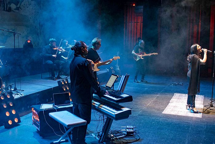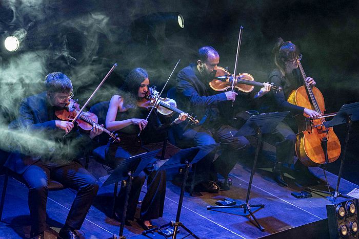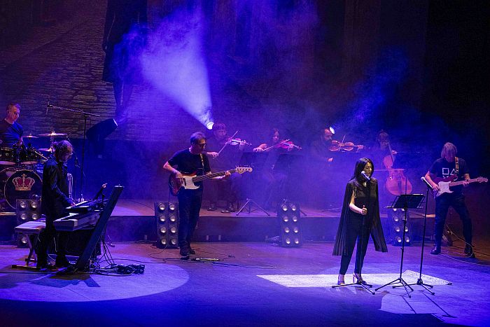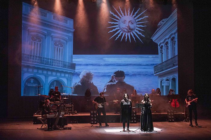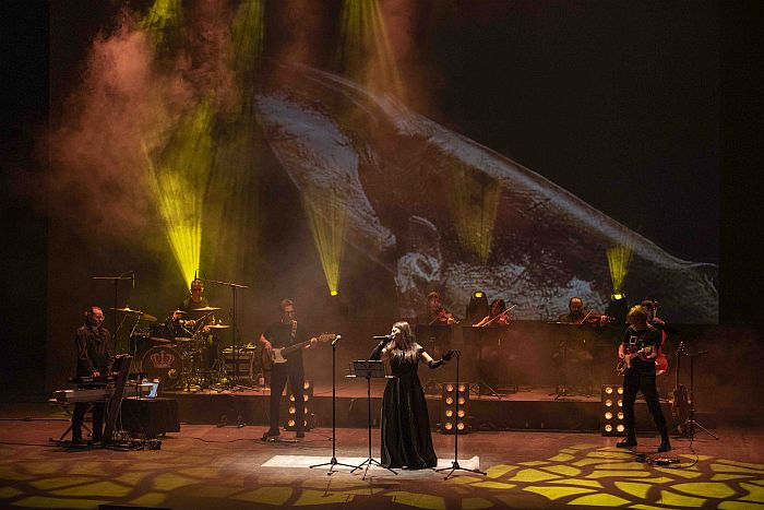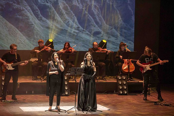 Bajo, batería, teclados y guitarra, un cuarteto de cuerdas y dos voces líricas conforman la banda que durante dos horas y apoyados por proyecciones alusivas, a veces de época, otras surrealistas y, cómo no, cercanas al western cuando la ocasión lo precisaba, dan lustre a un concierto intenso que se escucha y estimula la memoria ante tantos pasajes y escenas indivisibles a su banda sonora.