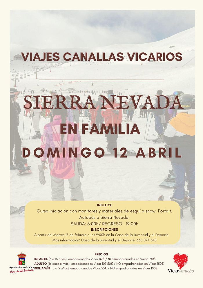 Desde el Ayuntamiento de Vícar, a través del Área de Deportes, se propone esta salida a Sierra Nevada como alternativa familiar al Fin de Semana Blanco, dirigido a un público más juvenil. Es, además, una excelente oportunidad para quienes quieren disfrutar de un domingo diferente sin la necesidad de pernoctar fuera de casa.