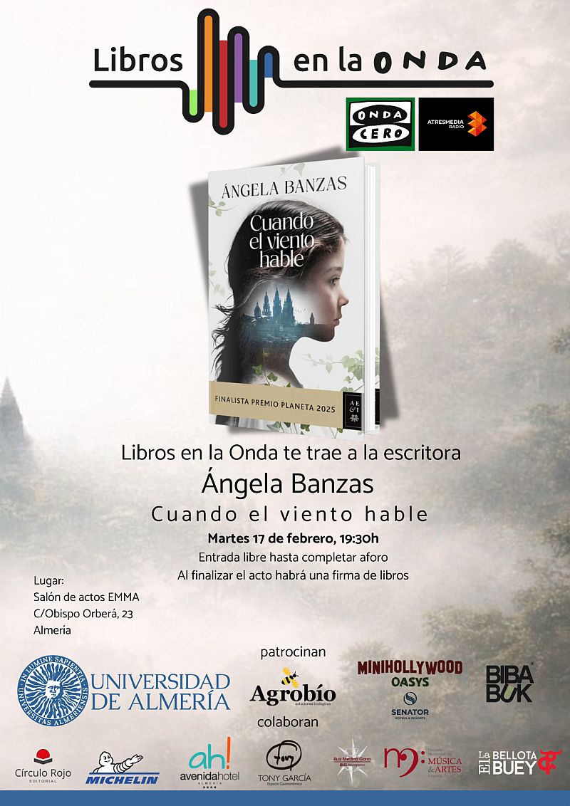 El proyecto cultural «Libros en la Onda» de Onda Cero, ha organizado una cita literaria de excepción. El próximo martes 17 de febrero recibiremos en Almería a la escritora Ángela Banzas, quien presentará su más reciente obra: Cuando el viento hable.
