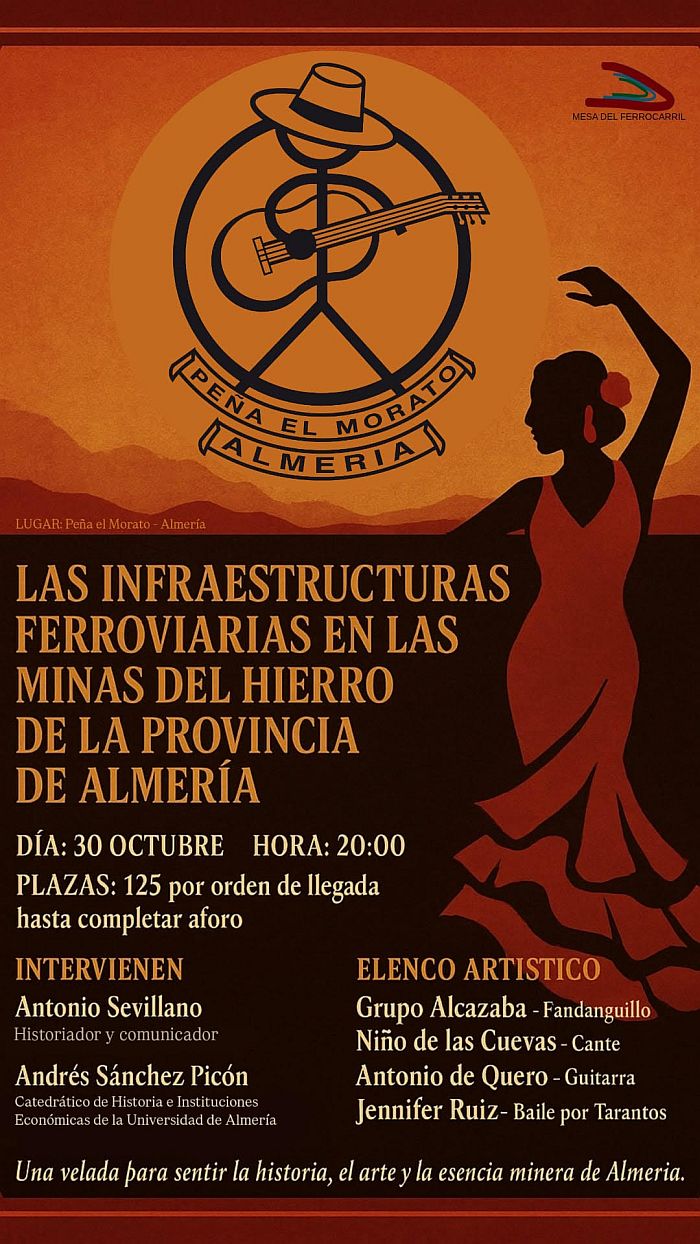 Entendemos desde la Mesa, que asuntos de tanta importancia como es el inicio de las obras y su conexión viaria y ferroviaria del Puerto Seco de Níjar, el futuro tren de cercanías del Bajo Andarax, la conexión ferroviaria con la Comarca del Poniente, la construcción de andenes en la Estación de Almería o la conexión con el Puerto de Almería, son infraestructuras que hay que comenzar a priorizar y contemplar en los presupuestos, bien en porcentajes de 100×100 o en otro tipo de porcentaje que se acuerden a través de la firmas de convenios con el Gobierno de España. En este sentido recordar que:El Estatuto de Autonomía de Andalucía otorga a nuestra comunidad la competencias en ejecución, participación en la planificación y gestión de infraestructuras ferroviarias de titularidad estatal dentro de su territorio, y competencias exclusivas sobre ferrocarriles de titularidad privada que transcurran íntegramente por Andalucía. Os iremos informando sobre este asunto.Constitución de una Mesa informativa con la Universidad de Almería.Informaros una gran noticia, como es la futura constitución de una Mesa i sobre el futuro corredor ferroviario que como sabéis estamos reclamando desde hace varios años. Que sea la Universidad anfitriona parte de una reunión que mantuvimos con el Rector de la Universidad y donde nos brindo su apoyo para esta iniciativa que esperamos que se convoque lo antes posible y donde estarían presentes instituciones de la provincia y agentes sociales . Os pasaremos información, conforme vayan surgiendo novedades .Charla-coloquio, cante y baile en torno a las minas de hierro de la provincia de Almería. X aniversario de la Mesa del Ferrocarril.El próximo día 30 de octubre a partir de las 20 horas en la Peña del Morato , llevaremos a cabo un acto por su formato novedoso y muy interesante en torno a las minas de hierro de nuestra provincia . Andrés Sánchez Picón, nos hablará de la historia económica que supuso la explotación del mineral de hierro, que a su vez generó las primeras infraestructuras ferroviarias en la provincia de Almería. Antonio Sevillano nos hablará de la cuna de los cantes mineros que se inició en siglo pasado aquí en Almería, e irá acompañada su intervención con el cante minero de Antonio «El niño de la Cuevas» y a la guitarra Antonio de Quero. Con la intervención al baile de Jennifer Ruiz que bailará por tarantos y del Grupo Alcazaba que bailará un fandanguillo de Almería. Como veréis en el cartel hay 125 plazas hasta llenar el aforo de la Peña , de las cuales 30 están reservadas para los socios de la Mesa, así que por correo ir comunicando vuestro interés en que os reservemos alguna, si os pedimos que como máximo vuestra petición sea para dos personas por organización.