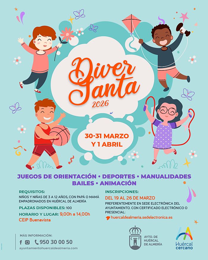 El Ayuntamiento de Huércal de Almería pone en marcha un año más ‘DiverSanta’, un espacio de diversión, aprendizaje y conciliación para niños y niñas de 3 a 12 años durante los días de Semana Santa, que se va a desarrollar los días 30 y 31 de marzo y 1 de abril en el CEIP Buenavista de la localidad, en horario de 9:00 a 14:00 horas. Las inscripciones son gratuitas y se abrirán este 19 de marzo, con 100 plazas disponibles.