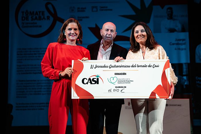 Tras el acto, el presidente de CASI, Antonio Bretones, entregó un cheque con la donación, la recaudación íntegra del evento benéfico, un total de 14.840 euros, que recogió la presidenta de la Asociación Española Contra el Cáncer en Almería, Magdalena Cantero. La presidenta de la Asociación ha afirmado que “quiero agradecer al presidente y a todos los socios y proveedores de CASI su generosidad. Me gustaría destacar el trabajo de los agricultores de esta gran cooperativa, que cultivan cada día con sus manos un producto, el tomate, que se ha convertido en un gran embajador del campo almeriense, presente en millones de hogares de toda Europa”. Esta frase la desarrolla explicando que “este dinero se dedicará a ayudar a las personas con cáncer y sus familias, y a la investigación, que, junto a la prevención, conforman el propósito de nuestra Asociación”.
