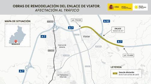 El Ministerio de Transportes y Movilidad Sostenible está ejecutando las obras de remodelación del enlace entre la Autovía del Mediterráneo (E-15/A-7) y la A-92 en Viator, en la provincia de Almería, con un presupuesto vigente de 38 millones de euros (IVA incluido). El objeto de esta actuación es la ampliación de la capacidad del enlace de Viator mediante la ejecución de cuatro nuevos ramales directos entre las autovías A-7 y A-92, así como el rediseño de los cuatro ramales del enlace actual.