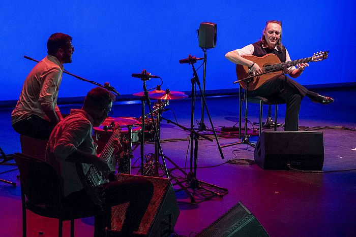 ‘Tangos del arco bajo’ abrió el diálogo colectivo con un aire rítmico y contemporáneo, donde el bajo dibujó una arquitectura sólida sobre la que la guitarra principal voló con naturalidad. ‘Autorretrato’ confirmó el carácter introspectivo del maestro, una pieza en la que cada silencio estaba medido.