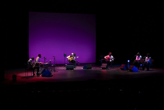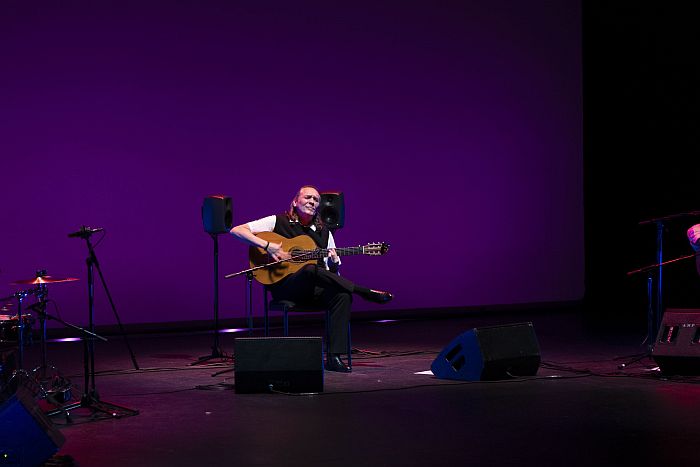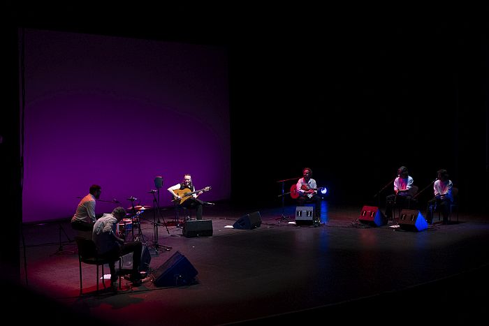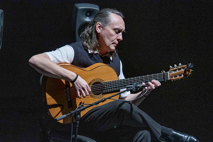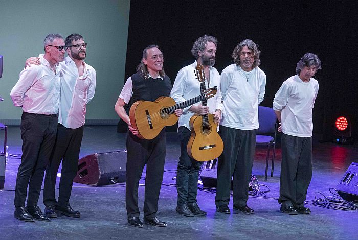 Tras el arranque en solitario, se sumó el quinteto que lo acompaña en esta gira: Añil Fernández a la segunda guitarra, Popo al bajo, Paquito Fernández en la percusión y los hermanos Makarines -Maka y José- en palmas y coros. Con ellos, el repertorio desplegó un arco expresivo que transitó por distintas estaciones sonoras.